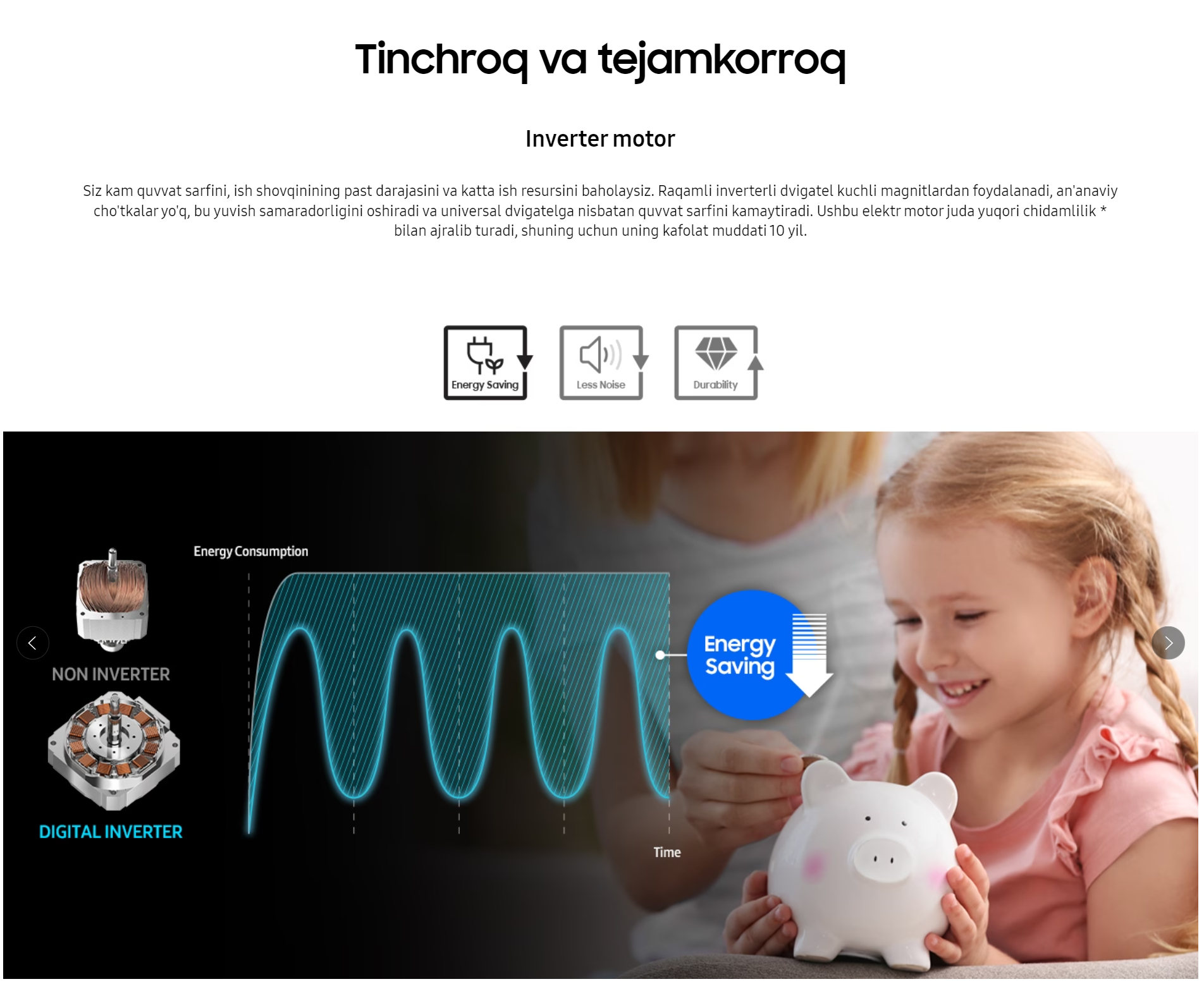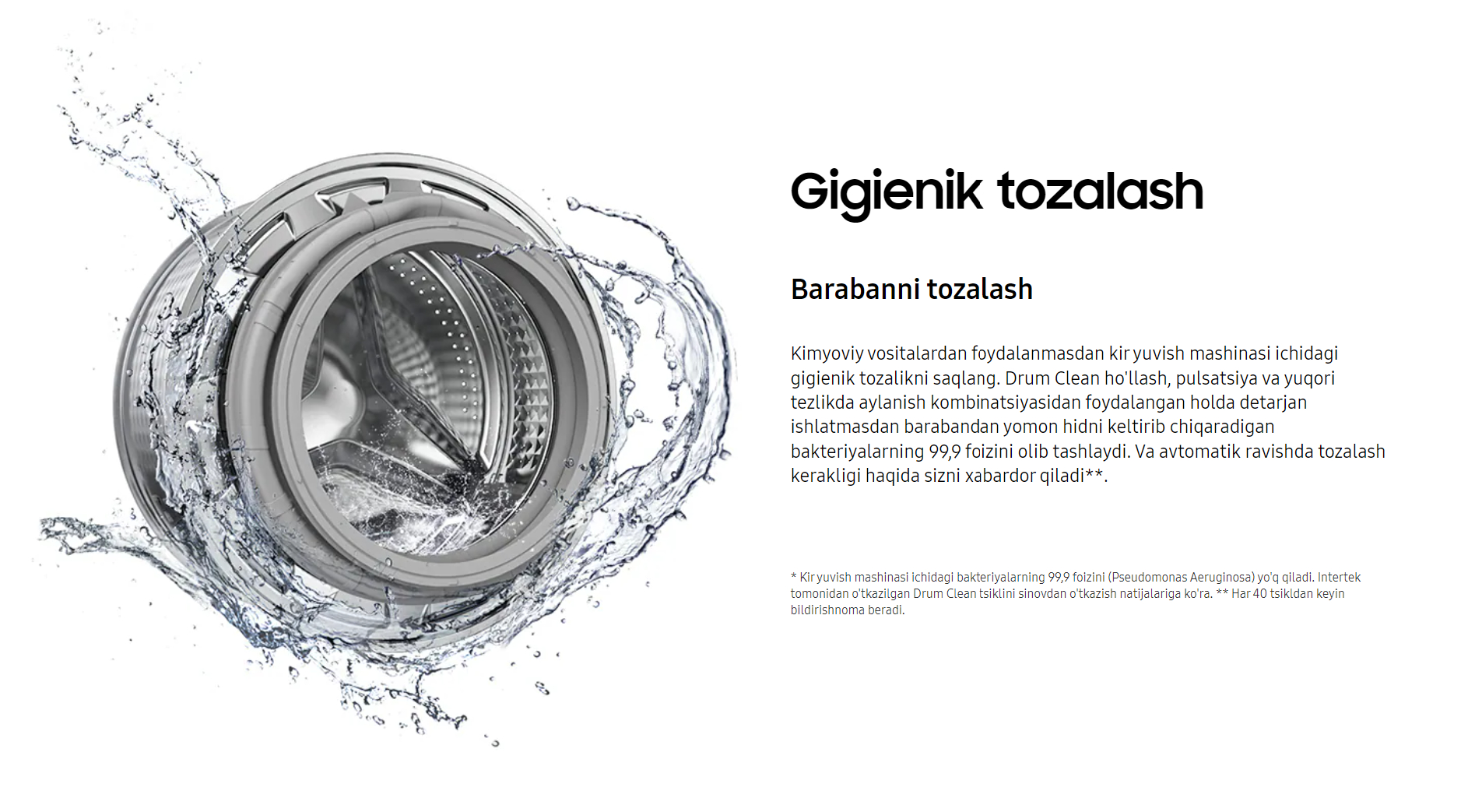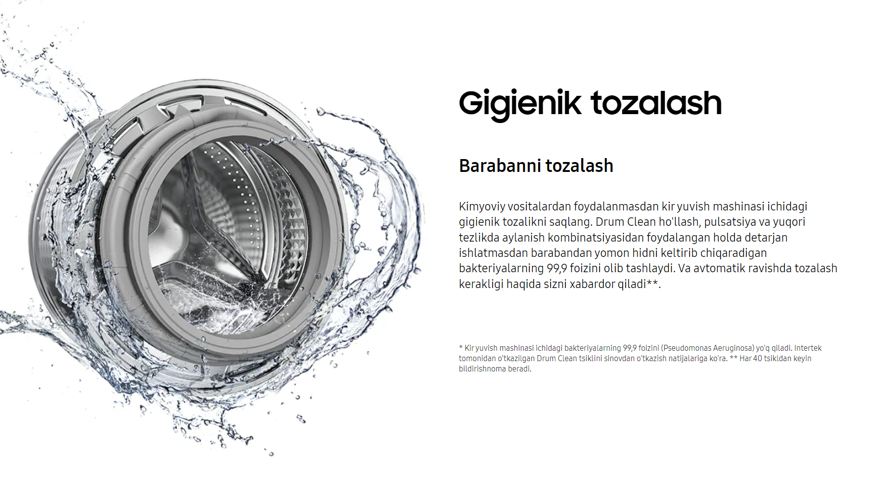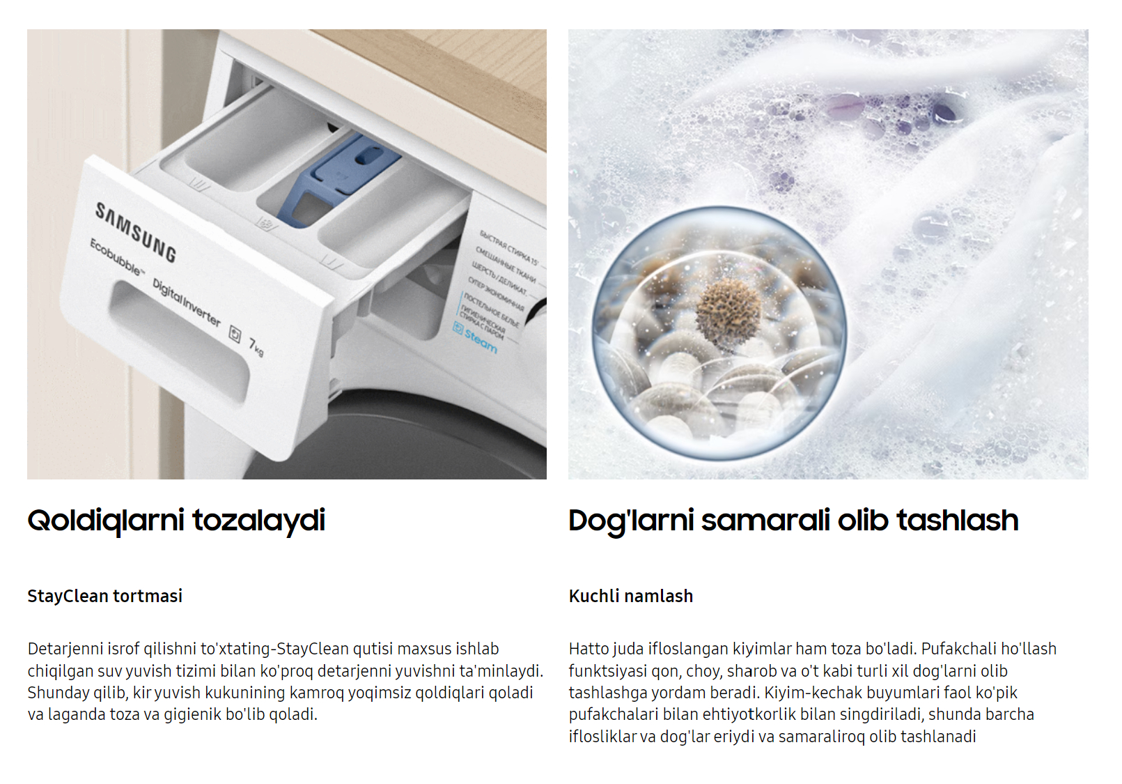 Yuvish vositalarini behuda sarflashni to‘xtating – StayClean tortmasi maxsus ishlab chiqilgan suv yuvish tizimi yordamida ko‘proq yuvish vositalarini yuvib tashlashni ta’minlaydi. Shunday qilib, kir yuvish kukuni qoldiqlari kamroq qoladi, tortma esa toza va gigiyenik bo‘lib qoladi.