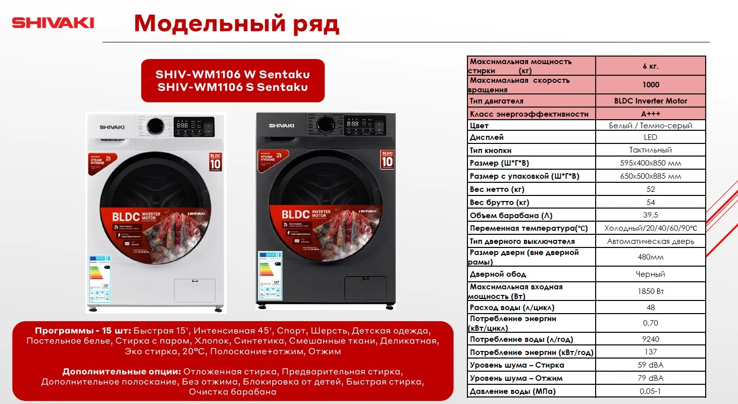 SHIV-WM 1106 Sentaku kir yuvish mashinasini tanlab, siz vaqt va energiyani tejashga, shuningdek, atrof-muhitga g‘amxo‘rlik qilishga yordam beradigan ishonchli va samarali qurilmaga ega bo‘lasiz.