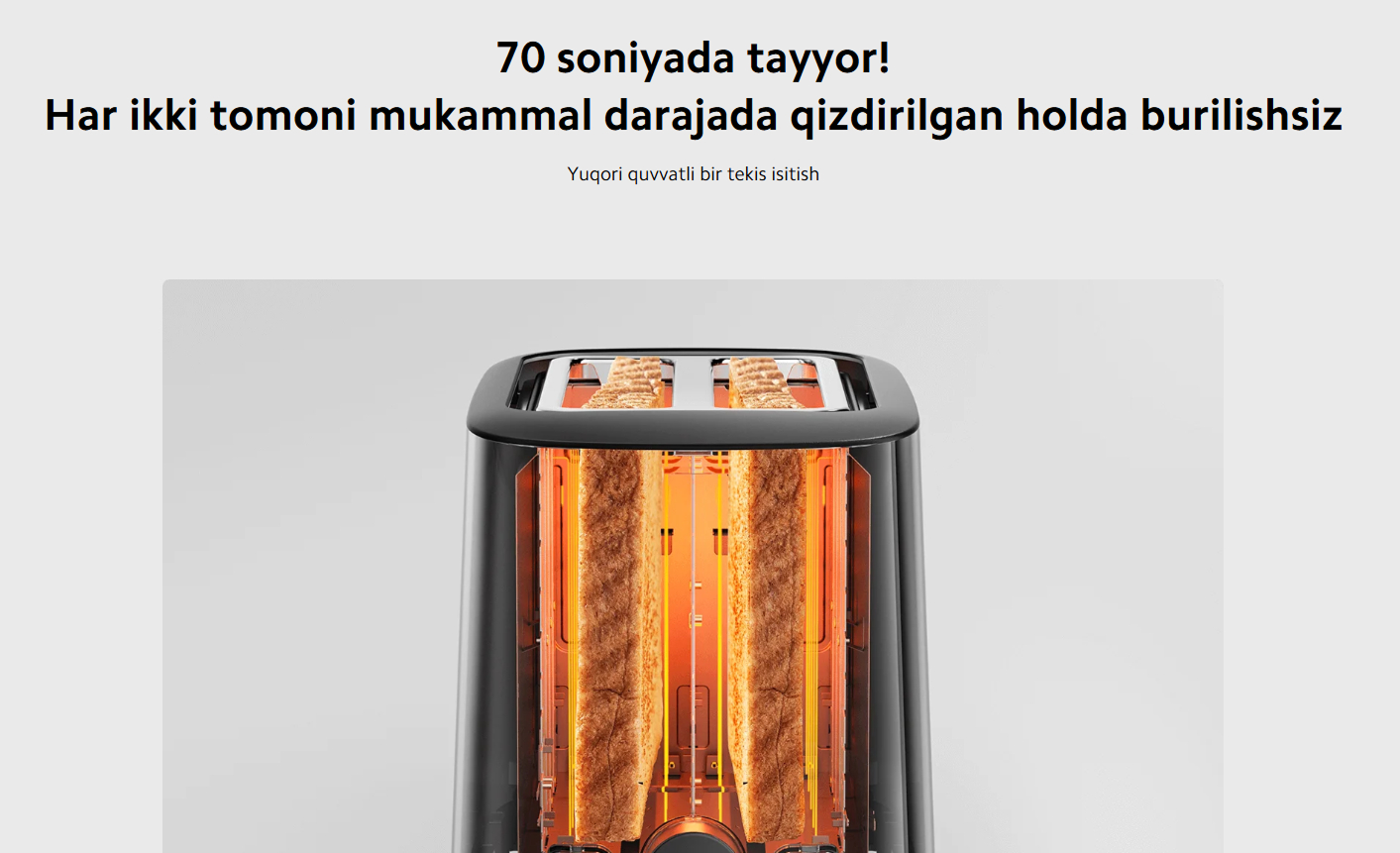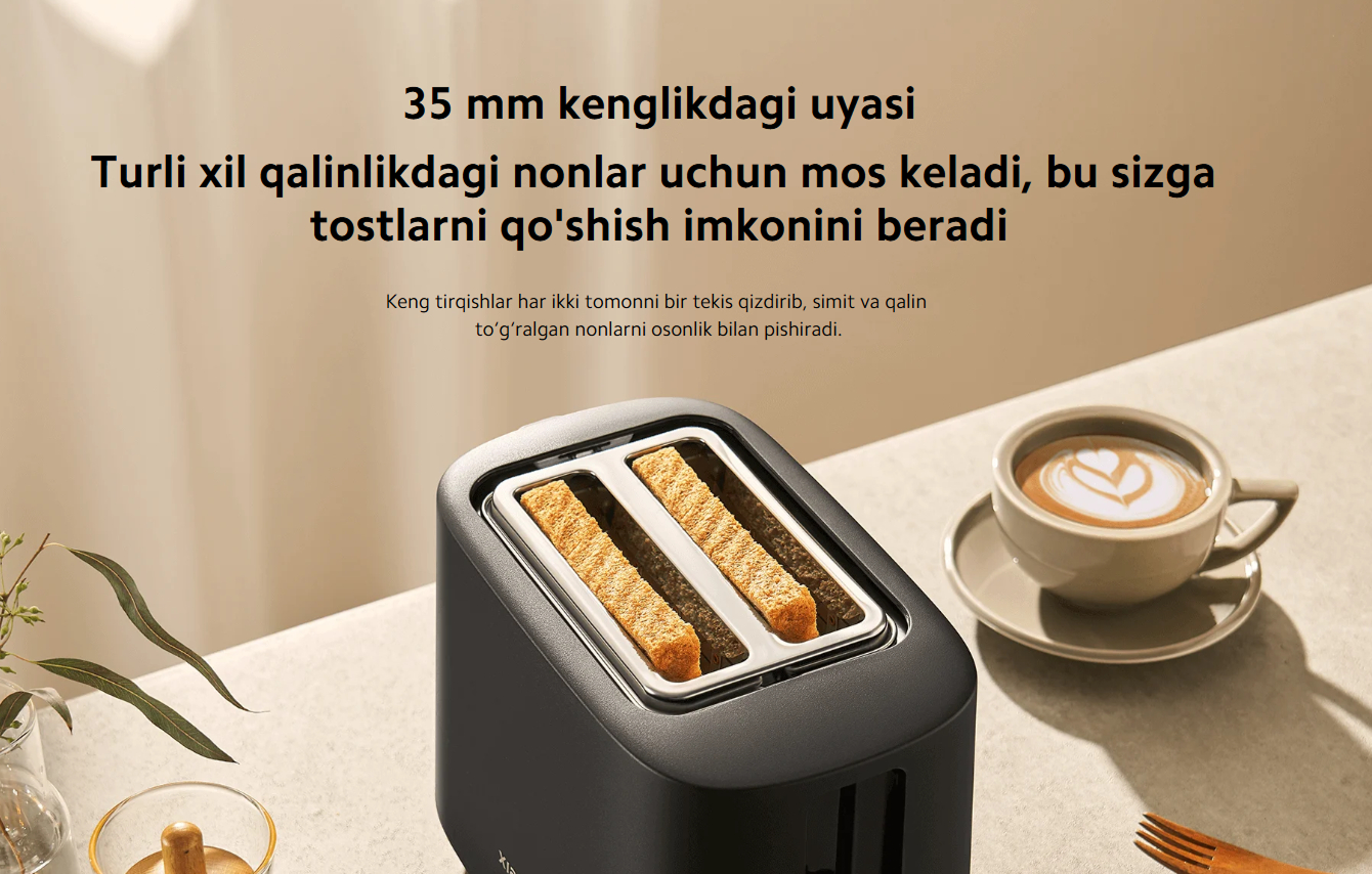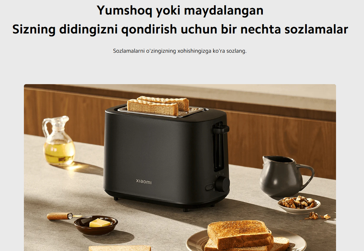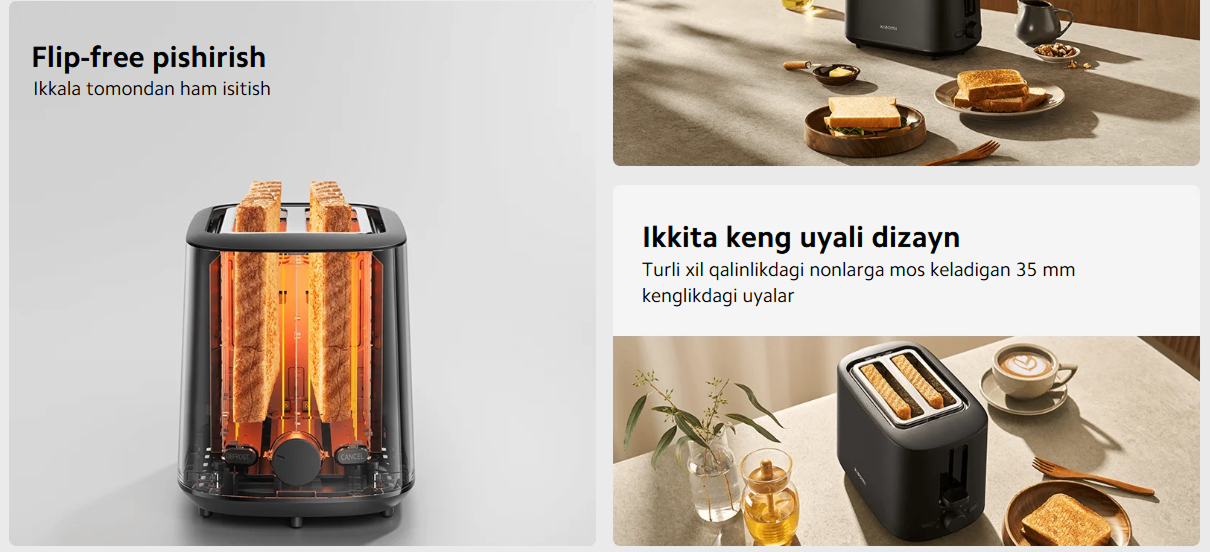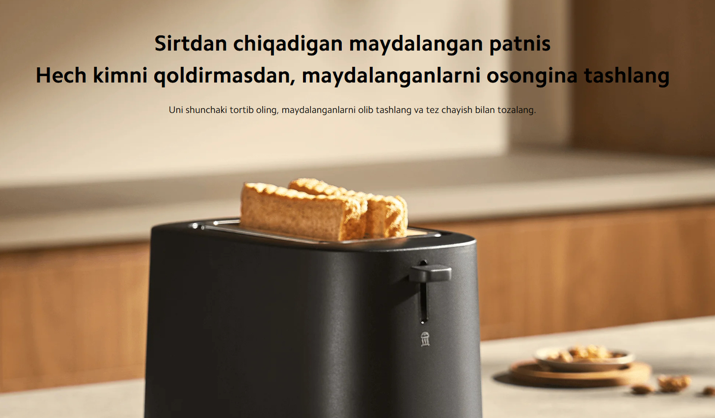 Xiaomi Toaster EU — bu zamonaviy va ixcham non qovuruvchi qurilma bo‘lib, kundalik foydalanish uchun qulaylik va ishonchlilikni taqdim etadi. Xiaomi brendiga xos minimalistik dizayni bilan u har qanday oshxona interyeriga mos tushadi. Ushbu toster yordamida siz non, bulka yoki boshqa non mahsulotlarini tez va teng darajada qovura olasiz. 220–240 V kuchlanishda va 50–60 Gts chastotada ishlaydi, 780 dan 930 Vt gacha bo‘lgan quvvat esa tez va samarali qizdirishni ta’minlaydi. Og‘irligi bor-yo‘g‘i 1,2 kg bo‘lgan bu qurilma ixcham va yengil, kichik oshxonalar uchun ayni muddao.