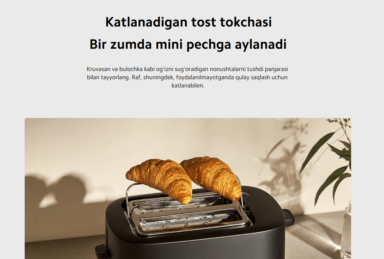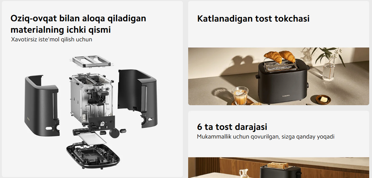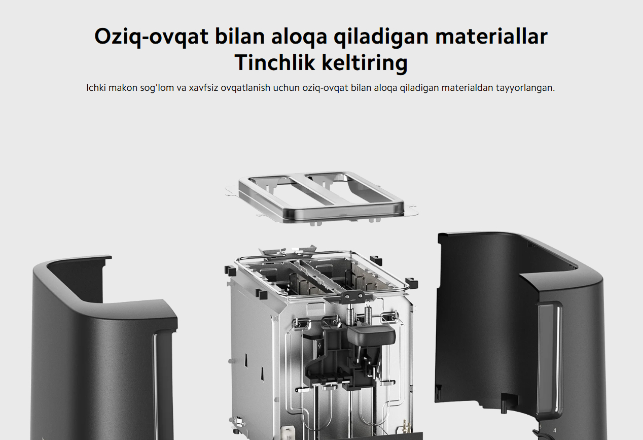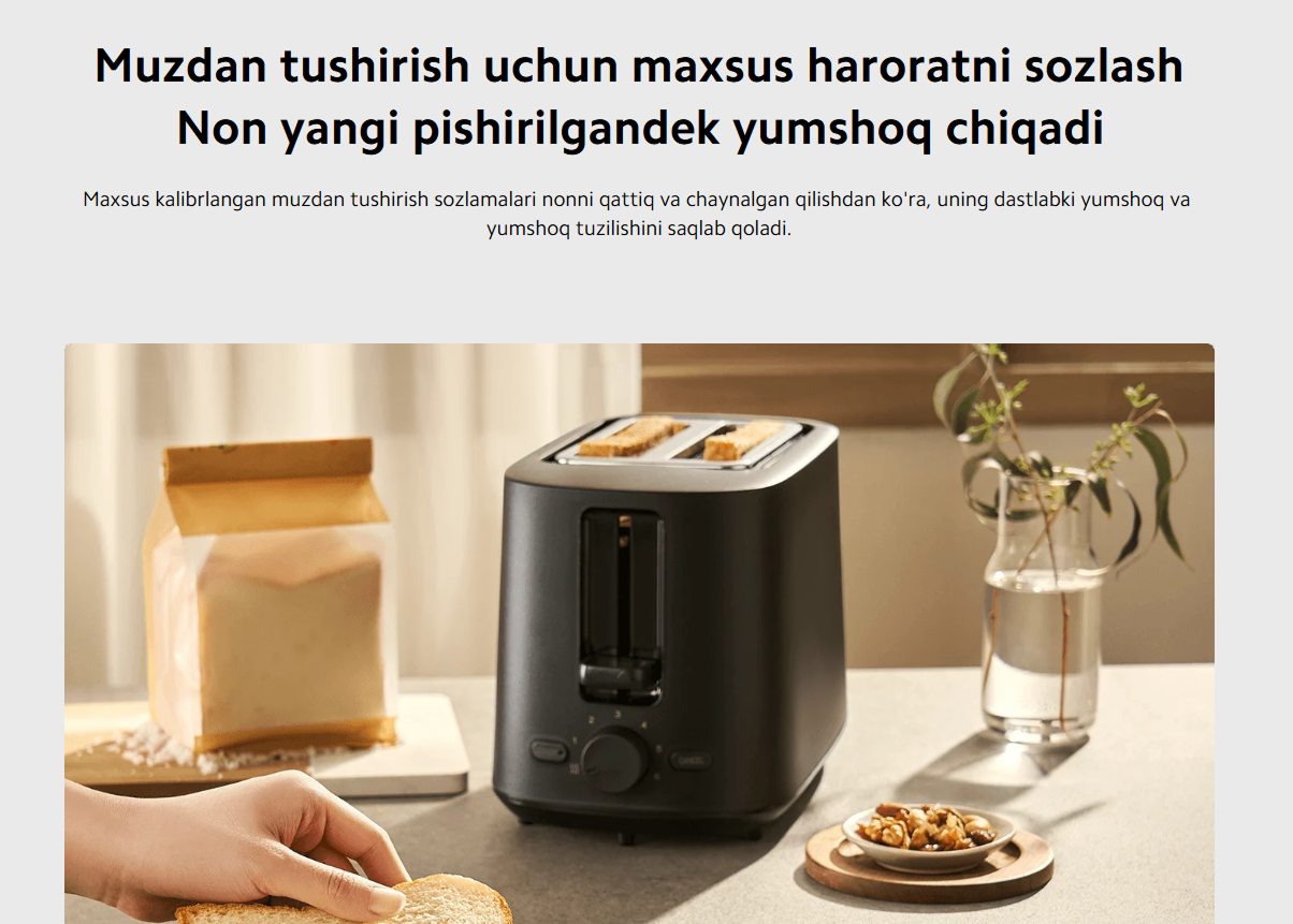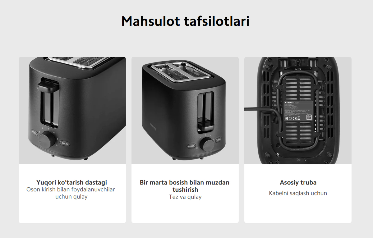 Xiaomi Toaster EU — bu zamonaviy va ixcham non qovuruvchi qurilma bo‘lib, kundalik foydalanish uchun qulaylik va ishonchlilikni taqdim etadi. Xiaomi brendiga xos minimalistik dizayni bilan u har qanday oshxona interyeriga mos tushadi. Ushbu toster yordamida siz non, bulka yoki boshqa non mahsulotlarini tez va teng darajada qovura olasiz. 220–240 V kuchlanishda va 50–60 Gts chastotada ishlaydi, 780 dan 930 Vt gacha bo‘lgan quvvat esa tez va samarali qizdirishni ta’minlaydi. Og‘irligi bor-yo‘g‘i 1,2 kg bo‘lgan bu qurilma ixcham va yengil, kichik oshxonalar uchun ayni muddao.