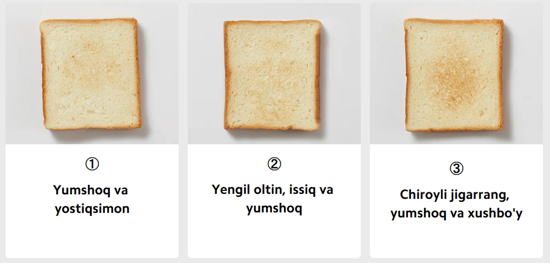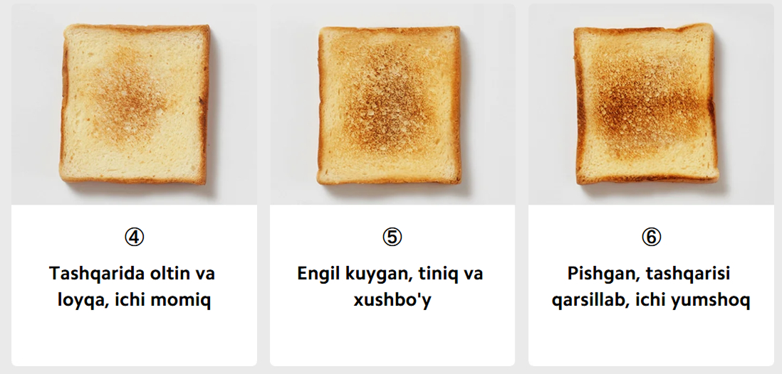 3) Qovurish darajasini sozlash — har bir foydalanuvchi o‘z didiga mos ravishda engil yoki kuchliroq qovurilgan nonni tanlay oladi.