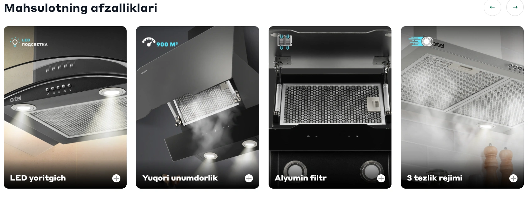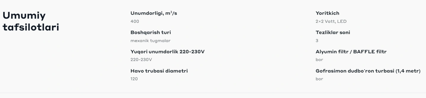 - Ishlash quvvati: 400 m³/soat — oshxonada o'rtacha darajadagi havo tozalash uchun.