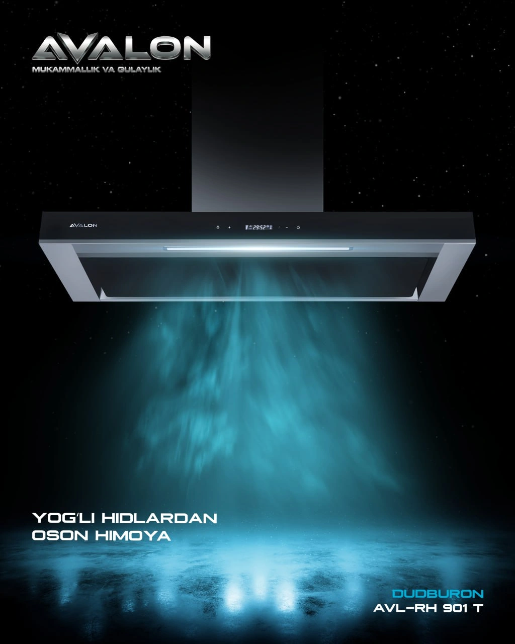 Avalon AVL-RH901T havo tortkichidagi ko'mir va alyuminiy filtrlari oshxonadagi havoni kuyish, kuyikish, yoqimsiz hid va boshqa zararli hidlardan tozalaydi. Undagi maksimal tortish quvvati bir soat ichida 1000 kubometrni tashkil qiladi. Ushbu havo tortkichda 3 ta tezlik rejimini mavjud bo'lib va ularni oddiy sensorli panel va masofadan boshqarish pulti yordamida boshqarish mumkin.